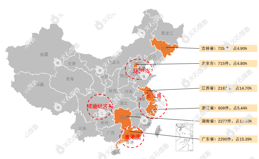 188个获批注册上市项目中,截止目前前五个省市分别为北京市 51项、上海市 33项、广东 30 项、江苏 25 项、浙江15项,五省市总和占总数的82%;